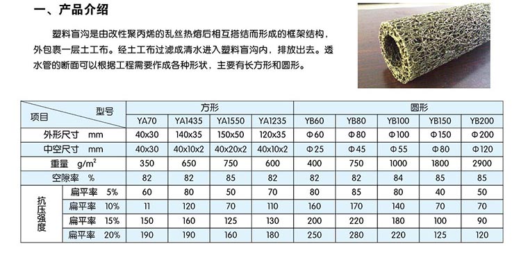 塑料盲溝是由塑料芯體外包裹濾布組式。塑料芯體是以熱可塑性合成樹脂為主要原料,經(jīng)過改性,在熱熔狀態(tài)下,通過噴咀擠壓出細的塑料絲條,再通過成型裝置將擠出的塑料絲在結(jié)點上熔接,形成三維立體網(wǎng)狀結(jié)構(gòu)。