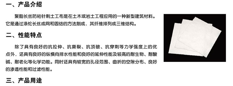 長絲土工布為聚酯長絲針刺無紡土工布,不含化學添加劑,也不經熱處理,是環(huán)保型的建筑材料。